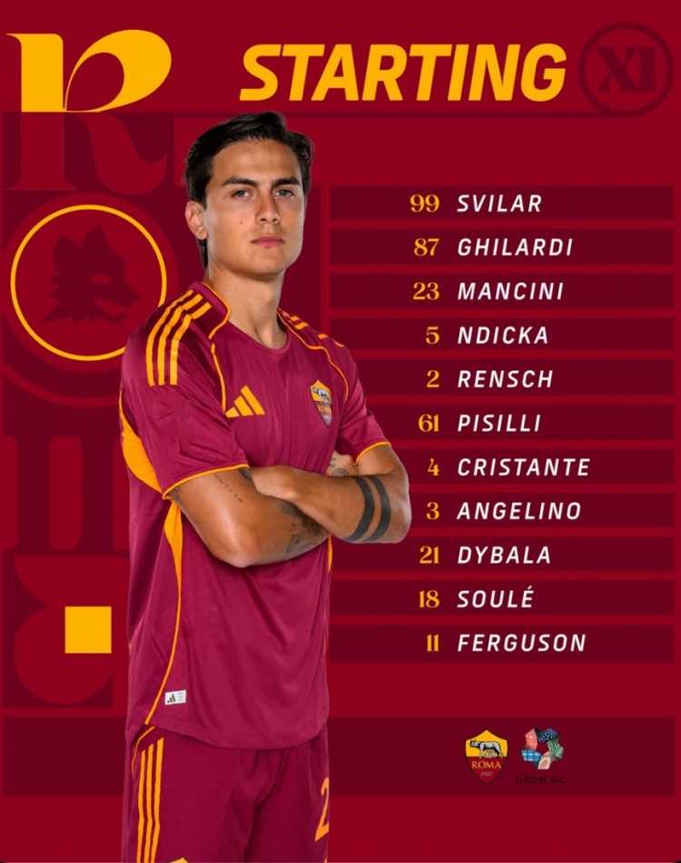 罗马友谊赛首发:迪巴拉领衔,苏莱、弗格森、皮西利、曼奇尼在列