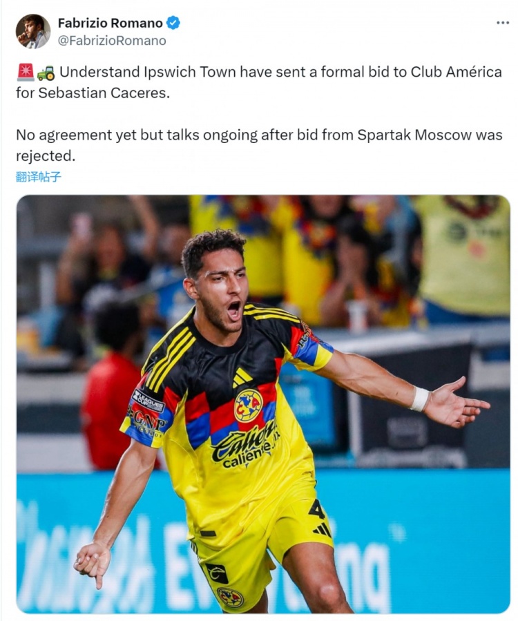 8月22日,知名记者罗马诺透露,英冠球队伊普斯维奇已正式向墨西哥美洲俱乐部求购26岁乌拉圭中卫卡塞雷斯。